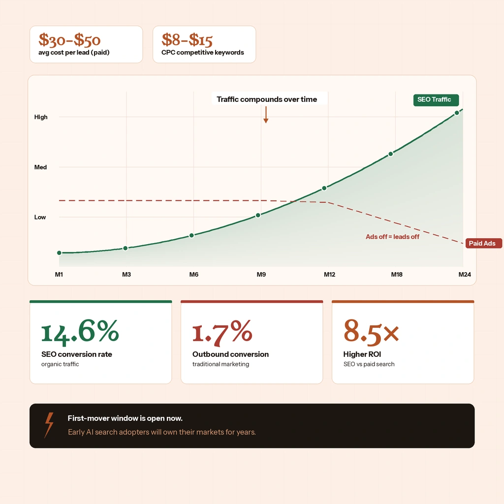 SEO works differently. The traffic compounds. A model comparison page you publish in March keeps generating leads in September. A service page optimized for “transmission repair [city]” sends you appointments for years, not days. Businesses that invest in organic search see average conversion rates of 14.6% from SEO traffic, compared to just 1.7% from traditional outbound marketing. The ROI isn’t close.